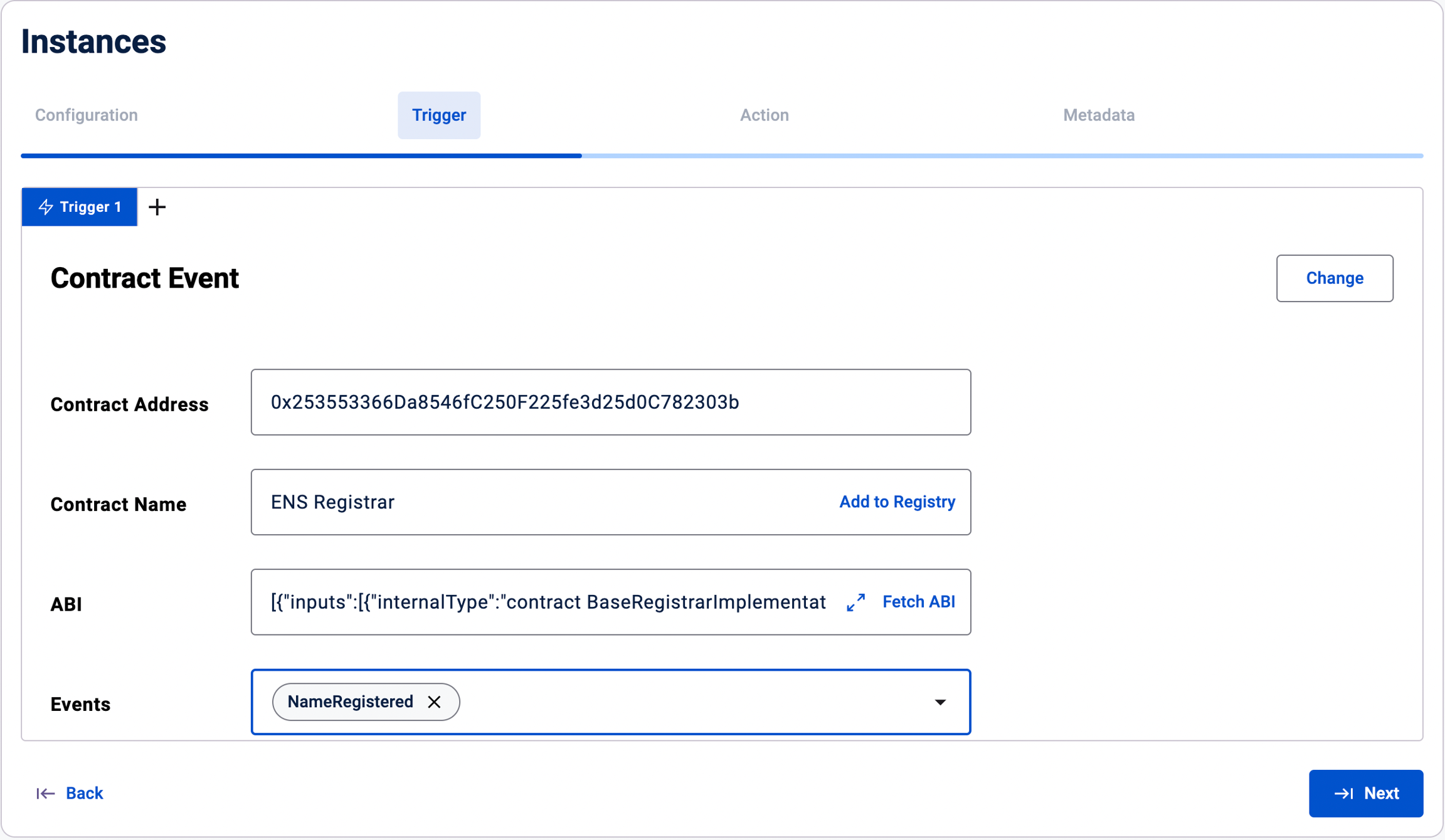 Event Selection: Select the specific event(s) from the contract that you want to use as triggers.